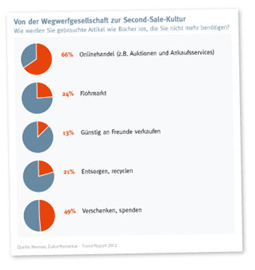Die immer intuitivere Verquickung von Online- und Offline-Welt spiegelt sich im Trend „Second-Sale-Kultur“ wider. Unternehmen erkennen zunehmend, dass sich die Spielregeln des Konsumierens ändern und eine Web2.0-geprägte Generation neue Anforderungen stellt. Teilen, Nutzen und Wieder-in-Verkehr-bringen sind die Wünsche, die Konsumenten von morgen großschreiben. Die neue Verkaufsformel lautet Tauschen plus Verkaufen = Swapping. Ikea veranstaltete beispielsweise in Amsterdam jüngst einen „Husselmarkt“, bei dem Kunden ihre Möbel tauschen konnten. Zusätzlich stellte Ikea für die Swap-Party neue Ereinrichtungsgegenstände im Wert von 12.000 Euro zur Verfügung. Neben der Offline-Aktion entwickelte Ikea das Online-Tool „husselen.nl“, mit dem virtuell Möbel gerückt werden können. Ikea hat erkannt, dass Tauschen nicht zwangsläufig weniger Umsatz bedeutet, sondern auch Absatzchancen bietet – und wenn das ausgetauschte Sofa nur nach neuen Kissen trachtet. Der japanische Modehändler Uniqlo geht noch einen Schritt weiter. Erklärtes Ziel ist es, alle verkauften Produkte auch wieder zurückzunehmen und in den Wertschöpfungsverkehr zurückzuführen. Die Initiative „All-Product-Recycling“ wird bereits in Läden in den USA, Frankreich und Großbritannien umgesetzt. Dem Offline-Handel eröffnen sich neue Positionierungs-Chancen.
