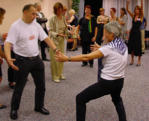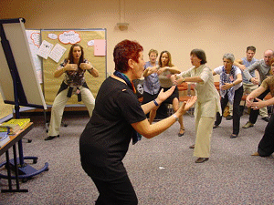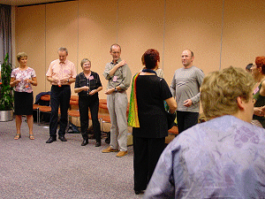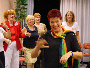 Danach ein paar Wahrnehmungsübungen und nach der Pause ging es dann so richtig los. Wir kommunizierten mit den Menschen von anderen Sternen, lernten ihre Begrüßungsrituale und Umgangsformen, unterhielten uns in einer Sprache, die wir vorher noch nicht kannten. Apropos hielten, wir hielten uns vor lauter Lachen und Spaß den Bauch. Danach einige seriöse Stimmtrainingsübungen, wie Kirschkernbespucken in allen Varianten und einige tonale Übungen. Und zum Schluss das Wichtigste, wie betritt der Trainer ( Clown ) die Bühne? Natürlich mit einem bestimmten, dynamischen und überzeugenden „ JAAA !!!“. Wir lernten noch, dass der Clown seine rote Nase, die jeder von Petra erhielt, immer so aufsetzt, dass es keiner sieht. So fand das Treffen aller Clowns ( Teilnehmer mit roten Nasen ) deren Hände sich nicht mehr lösen konnten statt. Am liebsten hätten wir uns alle nicht losgelöst von Petra Klapps und ihrer wunderbaren Wandlung zwischen dezentem Humor und ihren/unseren ausgelassenen, witzigen Aktionen. Zum Schluss durften wir als Zugabe noch eine kurze Pantomime aus Ihrem Bühnenprogramm sehen.