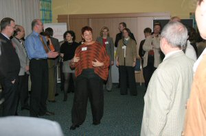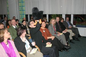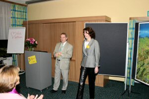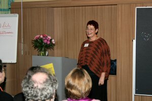 Nach der offiziellen Begrüßung durch Klaus Dannenberg und Margarete Piel begann Dr. Petra Klapps den Abend mit einem interessanten Vortrag, in dem sie ihre Zuhörer einerseits mit Hintergründen aus der Kulturgeschichte des Clowns und seinen Wandlungen im Laufe der Jahrhunderte bekannt machte und andererseits vom Humor, seinen Wirkungen auf die menschliche Gesundheit und seiner Bedeutung im menschlichen Miteinander berichtete. Sicherlich war es für viele neu, den Clown als ‚Gegenteiler’ zu verstehen, der alles sagen darf, weil er sich nicht in abfälliger Weise lustig über jemanden macht, sondern immer respektvoll zu seinem Gegenüber bleibt. Gekonnt eingesetzt ist dies sicher eine wunderbare Möglichkeit, auch im Unternehmensalltag die Dinge beim Namen zu nennen und an die wirklichen Probleme heran zu kommen.