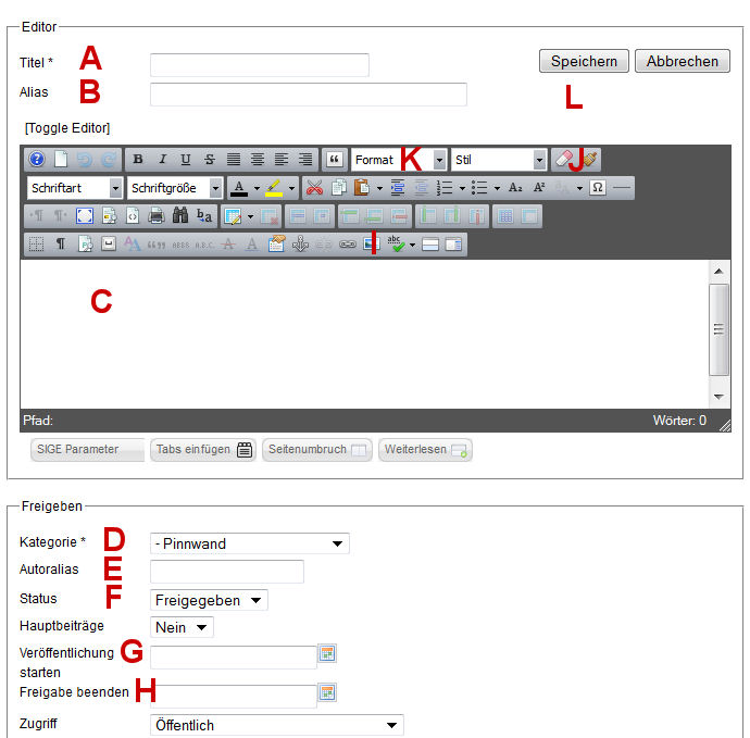 B.) Das Feld "Alias" lassen Sie leer. Es dient der Joomla-Internen Verwaltung der Beiträge. Joomla trägt dort dann selbst einen entsprechenden Schlüssel ein. Machen Sie das selbst, könnte es zu Problemen führen!