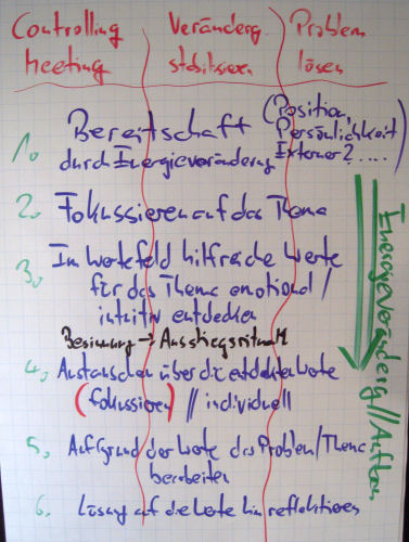 Der kollegiale Austausch mit ganz konkreten, anwendbaren Ergebnissen steht im Vordergrund. Und genauso gestaltete sich der Abend. Ganz oben auf der Prioritätsliste stand das Thema: „Energie – beachten und nutzen“. Schnell einigten wir uns darauf, dass sich „Energie“ sehr gut mit dem Thema „Werte“ verbinden lässt. Und da Bernhard immer noch von der Wertereflexion „Wertewanderung“ auf dem diesjährigen Trainertreffen in Hannover begeistert ist, überlegten wir uns, mit ihr zu experimentieren. Von (Teilnehmer) kam die Idee, vor einem Meeting über die Zielerreichung / Diskussion über Unternehmenszahlen die Energie mit dieser Intervention zu verändern. Seine Erfahrung: Es geht bei solchen Terminen immer um Verteidigung, Schutz und alle Beteiligten verlassen das Meeting mit schlechten Gefühlen.