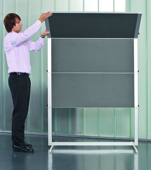 Schnelles Auf- und Zuklappen durch speziellen Scharniermechanismus. Transporttasche. Für effektive und zielgerichtete Gruppenarbeit. Doppelseitig filzbespannt oder kartonkaschiert. Besonders leichtes Einstechen der Nadeln auf beiden Seiten. Schnelle und einfache Montage. Elegantes Design mit umlaufendem Aluminiumrahmen. Mobil durch mitgelieferten Rollensatz (4 Rollen). Sicherer Stand durch feststellbare Rollen. Spezielle Fußkonstruktion ermöglicht die halbrunde Anordnung der Tafeln.