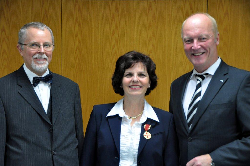 vlnr. Bernhard Siegfried Laukamp (Leiter Trainertreffen Deutschland und DVWO-Vizepräsident), Renate Richter (DVWO-Vizepräsidentin) mit der Verdienstmedaille, Landrat Rolf Menzel