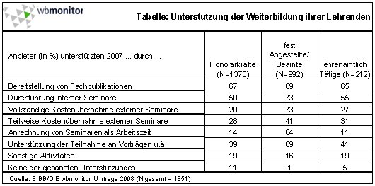 Die Mehrheit der Anbieter unterstützt die Weiterbildung ihrer Lehrenden; insbesondere die größeren Anbieter liegen hier vorn. Dabei profitieren vor allem die fest angestellten Lehrkräfte, die in dieser Branche jedoch in der Minderheit sind. Das Stammpersonal wird vielfach nicht nur durch Fachpublikationen, sondern auch bei der Teilnahme an Tagungen, Vorträgen oder Bildungsmessen sowie durch Freistellung und/oder Beteiligung an Weiterbildungskosten unterstützt. Auch die Durchführung interner Weiterbildungen und die Anrechnung von Seminarteilnahmen als Arbeitszeit haben einen hohen Stellenwert (siehe Tabelle).