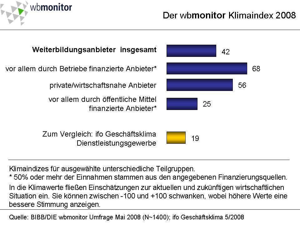 Trotz Wirtschafts- und Finanzkrise: Mit 42 Punkten auf einer Skala von -100 bis +100 signalisiert der wbmonitor Klimaindex für das Jahr 2008 eine ausgeprägt positive wirtschaftliche Stimmung in der Weiterbildungsbranche in Deutschland. Erhoben wurden diese Daten aller-dings im Mai 2008 – als der Konjunkturmotor noch lief. Jedoch: Während der ifo Geschäfts-klimaindex für das Dienstleistungsgewerbe in der Zeit von Mai 2007 bis Mai 2008 bereits von 27 auf 19 Punkte sank, stieg der wbmonitor Klimaindex in derselben Zeitspanne von 30 auf 42 Punkte an und erreichte eine neue Höchstmarke. Die Weiterbildungsanbieter in Deutschland schätzen demnach ihre aktuelle und zukünftige wirtschaftliche Situation deutlich positi-ver ein als das übrige Dienstleistungsgewerbe. Dies ist das Ergebnis der wbmonitor Umfrage 2008 unter mehr als 1.800 Anbietern beruflicher und allgemeiner Weiterbildung. Das Bundesinstitut für Berufsbildung (BIBB) und das Deutsche Institut für Erwachse-nenbildung (DIE) ermitteln hieraus den wbmonitor Klimaindex (siehe Schaubild 1).