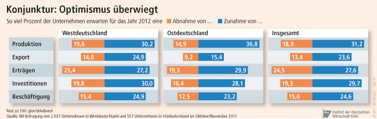 Trotz Finanz- und Schuldenkrise rechnen die Unternehmen in Deutschland nicht mit einer Rezession. So geht die Hälfte der Firmen davon aus, dass ihnen das nächste Jahr konstante Geschäfte beschert. Rund 31 Prozent erwarten für das Jahr 2012 sogar einen Produktionszuwachs, annähernd 19 Prozent ein Minus. Zu diesem Ergebnis kommt das Institut der deutschen Wirtschaft Köln (IW) in seiner aktuellen Herbst-Konjunkturumfrage, für die fast 2.600 Unternehmen in West- und Ostdeutschland befragt wurden.