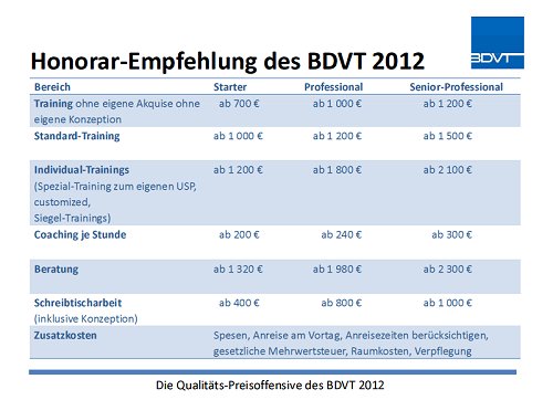 "Die Honroarempfehlung des BDVT schafft mehr Verwirrung als Klarheit. Die Unterteilung in die Kategorien Starter, Professionals und Senior Professional erscheint mir nicht sinnvoll. Denn welches Unternehmen würde schon bewusst einen Anfänger buchen? Manch eines zahlt zwar nur einen Tagessatz von 1.000 EURO - auch dafür erwartet es aber immer 100 Prozent Leitung vom Trainer. ... Auch wurde nicht berücksichtigt, dass es große Unterschiede je nach Thema und Branche gibt, ..." Quelle: Trainingaktuell 10/2012