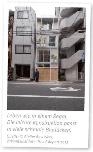 Ganz im realen Leben verwurzelt ist der Trend „Open Source City“. Dabei geht es um neue Formen der Stadtplanung. Getreu dem Offenheits-Ansatz kommen die Ideen auch hier von den Anwendern. Es geht um neue und optimale Flächenausnutzung, die vor dem Hintergrund des Megatrends Urbanisierung und knapper werdenden städtischen Wohnraums immer wichtiger wird. Eine zukunftsweisende Lösung realisiert das Architekturbüro Atelier Bow Wow (Tokio), das sich auf Minihäuser spezialisiert hat. Die Grundrisse und Räume sind maßgeschneiderte Antworten auf die Bedürfnisse der Nutzer. Kein Zentimeter bleibt ungenutzt. So entstehen spektakuläre Bauten zwischen den Bauten. Nur 40 Quadratmeter misst das kleinste Grundstück in Tokio für das Projekt „Bokutei“ (www.bow-wow.jp). Ein Mini-Haus könnte auch in den Ballungszentren Europas, ob in Berlin, Wien oder Zürich, mehr Menschen den Traum von den eigenen vier Wänden erfüllen.
