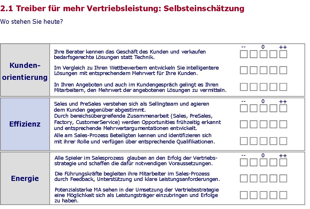 Werden nur Maßnahmen in einzelnen Bereichen durchgeführt, kann nicht das bestmögliche Ergebnis erzielt werden. Nur eine integrierte Maßnahmenpalette rund um die Vertriebsleistung mit den drei definierten Bereichen Stärken-/Schwächenanalyse, Umsetzungsbarriere beseitigen sowie Führungskräfte und Mitarbeiter befähigen, garantiert mehr Auftragseingang und eine höhere Performance. In der Stärken-/Schwächenanalyse sind dies z. B. die IST-Analyse des Sales-Prozesses, die Identifikation individueller Potenziale und Entwicklungsfelder sowie die Prozesssteuerung und Erfolgskontrolle. Der Bereich Barrieren abbauen umfasst ein gemeinsames Geschäfts- und Strategieverständnis im Sales-Prozess, die Teamentwicklung im Sellingbereich, Entwicklung der Schnittstellen sowie Standards im Sales-Prozess, Performance Management und Umsetzungs-Coaching sowie der Klärung eines verbindlichen Tooleinsatzes. Schließlich die Befähigung der Mitarbeiter durch die Qualifizierung der Vertriebsmitarbeiter (Persönlichkeitsentwicklung und Selbstmanagement, Produkt- und Methodenwissen, Sales- und Consultingskills, Rollen und Anforderungen im Sales Prozess) sowie der Führungskräfte im Vertrieb zum Thema Leadershipqualität.