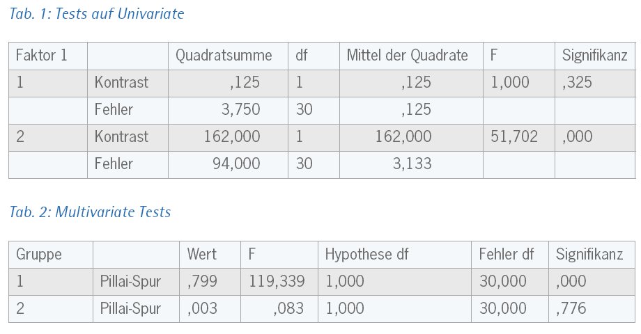 In Tabelle 2 zeigt sich nur bei Gruppe 1 F (1/30) = 119,339, p = 0,000 eine hochsignifikante Veränderung zwischen den Zeitpunkten, nicht bei Gruppe 2.