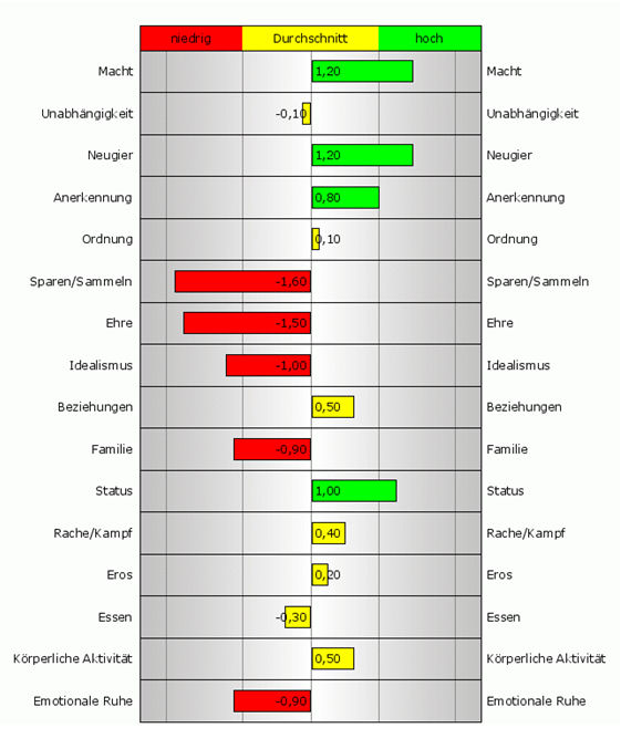 Intuitiv wissen wir oft, was uns zufrieden stellt und glücklich macht. Irgendwie spüren wir es, während es geschieht, oder nachdem es geschehen ist und wir zurückblicken. Um die Häufigkeit und Intensität solcher Momente in unserem Alltag zu verstärken, müssen wir unsere individuellen Auslöser für Zufriedenheit und Glück zunächst noch besser verstehen. Das Reiss Profile bietet einen wichtigen Anhaltspunkt dafür, da es Verborgenes oder bislang nur Erahntes sichtbar macht und Erklärungen für manche Fragen der Vergangenheit bietet. Entwickelt wurde es in den 90er Jahren von Prof. Steven Reiss, der über empirische Forschung die Werte und Motive identifizierte, die uns Menschen motivieren: Macht, Unabhängigkeit, Neugier, Anerkennung, Ordnung, Sammeln / Sparen, Ehre, Idealismus, Beziehungen, Familie, Status, Rache / Kampf, Eros, Essen, körperliche Aktivität und emotionale Ruhe. Jeder Mensch besitzt jedes dieser 16 Lebensmotive, allerdings ist sein jeweiliges Bedürfnis danach im Vergleich zu anderen unterschiedlich ausgeprägt. Als wissenschaftliches Diagnose-Instrument macht das Reiss Profile diese konkrete Motivation auf individueller Ebene sicht- und nutzbar (vgl. Abb.).