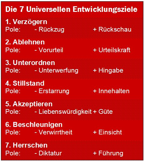 Entwicklungsziel – was bedeutet das überhaupt? Es geht hier nicht darum, sich im moralischen Sinne zu vervollkommnen. Eher sollen Menschen möglichst viele unterschiedliche Erfahrungen machen, die für die Entwicklung - nicht nur der Seele - wertvoll sind. Dabei sollen alle Aspekte unserer Welt erfahren werden. Die Entwicklungsziele werden durch drei gegensätzliche Ziel-Paare und einem neutralen Ziel gebildet: Verzögern und Beschleunigen; Ablehnen und Akzeptieren; Herrschen und Unterordnen; neutraler Mittelpunkt ist der Stillstand.