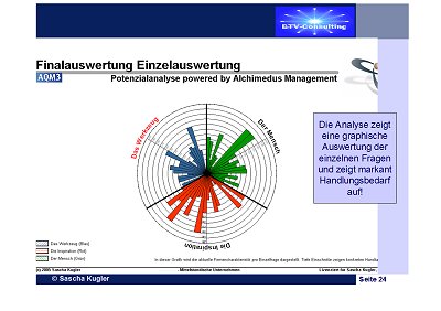 Mit der Alchimedus®-Methode steht nun ein Tool zur Verfügung, mit dem sich noch schneller mögliche Verbesserungen einstellen können. „Damit wird jedes Unternehmen - unabhängig von seiner Größe und Branche - in die Lage versetzt, die im Betrieb vorhandenen Kräfte zu mobilisieren und noch erfolgreicher zu sein“, so Brühl. „„Alchimedus ist eine neue softwaregestützte Methode, die es im Rahmen einer ganzheitlichen Betrachtung erlaubt, binnen weniger Stunden einen so genannten 360°-Rundumblick ins Unternehmen zu vermitteln.“ Nach Angaben von BTV ist es möglich, innerhalb von nur 5 bis 6 Stunden sowohl die Schwachstellen, als auch die viel versprechenden, im Unternehmen schlummernden Potenziale zu lokalisieren.
