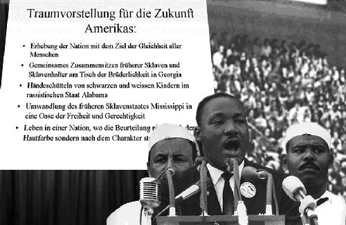 Doch stellen Sie sich vor, schon damals hätte es PowerPoint gegeben, und Martin Luther King hätte seiner Botschaft auf einem riesigen Bildschirm seine Kernaussagen mit PowerPoint unterstützt. Das hätte dann in etwa so aussehen können: