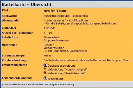 In „Karteikarten“ werden für jede Übung die Ziele, Inhalte und Rahmenbedingungen dargestellt und sind durch Links direkt aufrufbar.