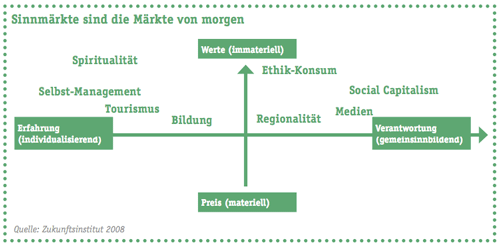 Eine neue Kultur der Selbststeuerung wird in vielen Branchen (Gesundheit, Food, Coaching, Retail) neue Geschäftsfelder eröffnen. Gesundheit wird zum Lifestyle-Produkt und Gesundherhaltung zu einem Prozess des (Selbst-)Konsums. Der zweite, private, Gesundheitsmarkt besteht aus vielen kleinen Wohlfühlmärkten wie Bioprodukte, Wellness, alternative Medizin usw. – schon jetzt geben die Deutschen auf diesem Markt jährlich 55 Milliarden Euro aus.