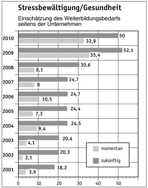 Dass den Unternehmen diese Thematik zunehmend unter den Nägeln brennt, belegt ein weiteres Ergebnis. Gefragt wurde nach dem konkreten Bedarf in den Betrieben: Werden den Mitarbeitern also entsprechende Weiterbildungsmaßnahmen aktuell angeboten oder nicht? In der Regel manifestiert sich in diesen Werten die aktuelle Wirtschaftssituation sowie die Frage, welche Themenbereiche eher als „Nice to have” – und damit als verzichtbar – angesehen werden, da sie keinen unmittelbaren Nutzen für das Unternehmen erwarten lassen. Doch auch hier mausert sich Stressmanagement vom Nischenthema zum festen Bestandteil im Maßnahmenkatalog der Unternehmen. Gaben in den Jahren zuvor nicht