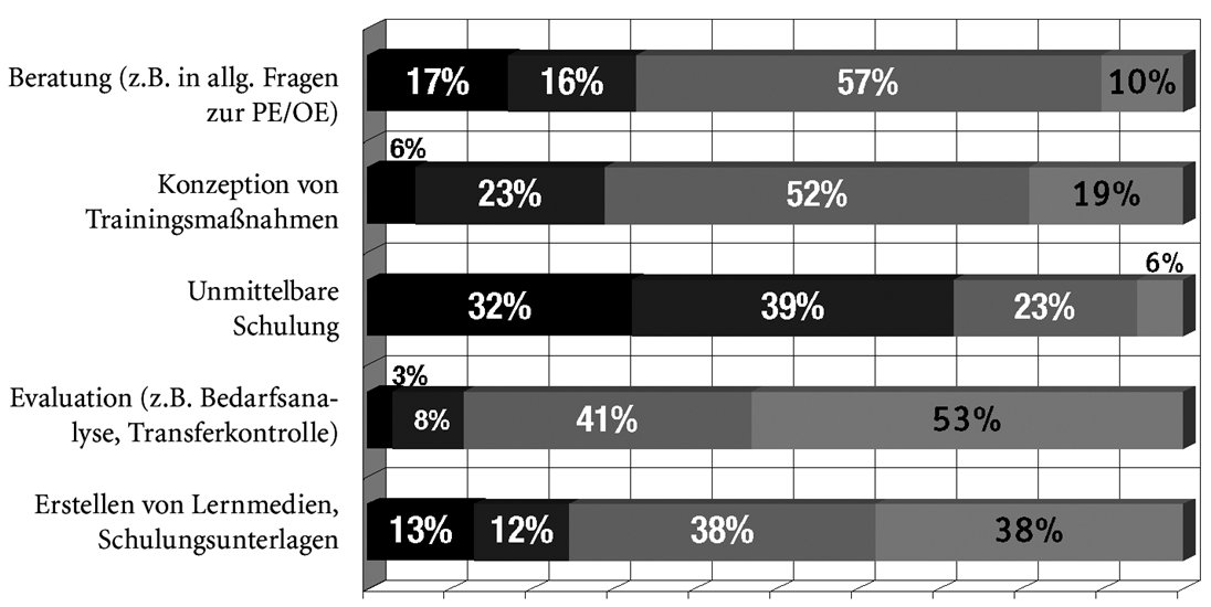 Stiefkind der Zusammenarbeit bleibt die Evaluation. Lediglich jedes zehnte der befragten Unternehmen greift hierfür regelmäßig oder häufig auf externe Dienstleister zurück. „Nachhaltigkeit scheint man zu wollen, aber bitte ohne großen Aufwand”, fasst eine Beraterin das Selbstverständnis der Unternehmen zusammen. Somit bewegt sich die Zusammenarbeit auf vertrautem Terrain: Drei von vier Betrieben beauftragen Weiterbildungsanbieter regelmäßig oder häufig mit der unmittelbaren Durchführung von Schulungen und Trainings – ein seit Jahren nahezu konstanter Wert.
