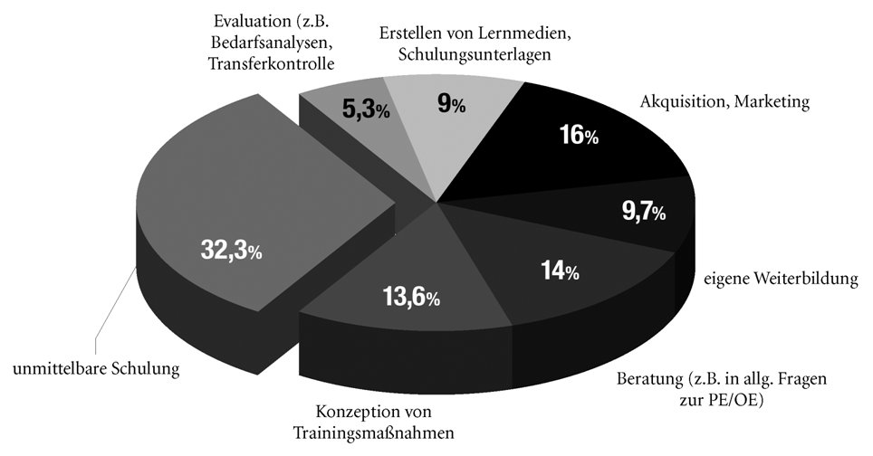 Auch die Aufgabenbereiche der Weiterbildungsanbieter zeichnen sich hinsichtlich ihres Zeit- und Arbeitsaufwands durch Kontinuität aus. Hierbei konstatieren die Weiterbildungsanbieter, dass sie gerade noch ein knappes Drittel der Arbeitszeit ihrem eigentlichen Kerngeschäft – Schulung und Training widmen (siehe Abb.2). Der Aufwand für alle Begleitaufgaben rund um die Schulung – Beratung, Konzeption, Medienerstellung und Evaluation – liegt mit 41 Prozent deutlich darüber. Ob nun Seminare einfach nur kürzer und komprimierter werden sollen oder lediglich als ein Element in einem individuell zugeschnittenen Lernarrangement fungieren – für Weiterbildungsanbieter zieht dies in jedem Fall Mehrarbeit nach sich: Der administrative Aufwand pro Maßnahme bleibt gleich, der konzeptionelle Aufwand steigt meist sogar, da Seminardesigns auf die spezifischen Anforderungen zugeschneidert werden müssen.