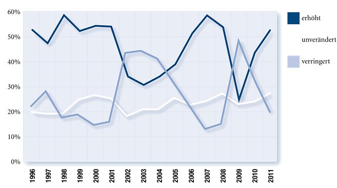 Die Auftragslage der Weiterbildungsbranche ist ein Spiegelbild dieses grassierenden PE-Aktionsmus’ in Unternehmen und erinnert nicht von ungefähr an das Auf und Ab der Börsenkurse (siehe Abb. 1). Gegenwärtig profitiert allerdings auch die Weiterbildungsbranche von der guten wirtschaftlichen Situation in Deutschland. Der Aufwärtstrend aus 2010 setzte sich nahtlos fort, viele Betriebe holten in Sachen Weiterbildung das nach, was dem Konjunktureinbruch 2008/2009 zum Opfer gefallen war. Die Folge: 53 Prozent konnten für das Jahr 2011 steigende Auftragszahlen verzeichnen (Vorjahr: 43 Prozent), lediglich jeder fünfte Weiterbildungsanbieter musste einen Rückgang der Aufträge hinnehmen (Vorjahr: 33 Prozent).