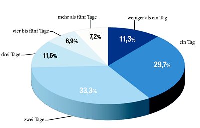 Lediglich knappe sechs Prozent der befragten Weiterbildungsanbieter stellen eine Erhöhung der Seminar- und Trainingszeiten fest, rund 30 Prozent beobachten hingegen eine weitere Verkürzung der Seminardauer. Wie sich dieser Trend in der Praxis niederschlägt, belegen eindrucksvoll Zitate aus früheren Befragungen: „Was früher ein Fünf-Tages-Training war, soll heute ein Drei-Tages-Training sein”, konstatierte vor drei Jahren eine Trainerin. „Das Verkürzen der Seminarzeit von zwei Tagen auf einen” beobachtet eine Trainerin in der aktuellen Befragung. Und ein anderer kommt inzwischen sogar zu der Feststellung: „Weniger Tagesseminare, dafür kleinere Einheiten.” Nach unten scheint also immer noch Luft zu sein. Bereits 41 Prozent der von Trainern durchgeführten Seminare sind auf maximal einen Tag angesetzt. Lediglich jede vierte Maßnahme beansprucht noch drei oder mehr Tage (siehe Abb. 2). Die betriebliche Weiterbildung orientiert sich eben mehr an betriebswirtschaftlichen und organisationalen Notwendigkeiten und weniger an didaktischen Erfordernissen und konkreten Lernzielen.