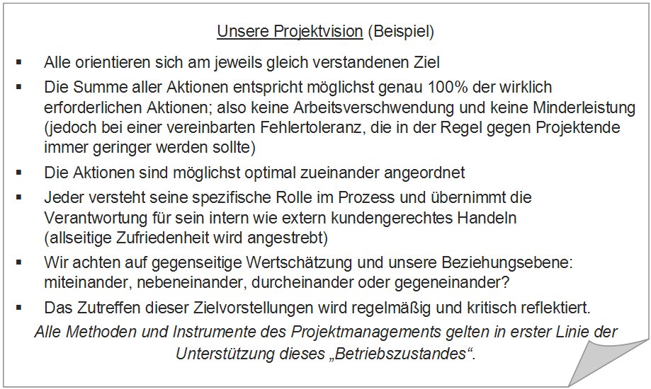 So viel zum Einstieg und zur Klärung. Aber wie schaffen wir es, das Wesentliche aus der Vielzahl teils irrelevanter Möglichkeiten herauszufinden, uns nicht zu verzetteln oder Anregungen zu folgen, die irgendwann einmal, für ganz andere Umstände, entwickelt worden sind? Zunächst müssen wir wissen, was wir wirklich wollen. Vor der Frage nach dem WIE (Methodik, Verfahren), sollten wir uns grundsätzlich die Frage nach dem WOZU stellen. Wozu dient das ein oder andere Hilfsmittel, wobei soll es uns unterstützen? Wir beobachten aber vor Ort in den seltensten Fällen eine vorangehende explizite Projektvision als Basis für weitere Vorgehens-Detaillierungen. Ein grober Fehler!