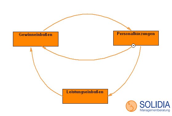 Dann kam einer auf die Idee, dass es wie bei der Einnahme mehrerer Arzneimittel Wechselwirkungen zwischen diesen Schlüsselvariablen geben könnte. In den folgenden Stunden definierten sie Beziehungen zwischen einigen Schlüsselvariablen, entwickelten und verwarfen verschiedene Hypothesen, bis sie schließlich die Entlassung der Mitarbeiter als eine Fehlkorrektur (s. Abb. 1) erkannten. Je größer die Gewinneinbußen, desto größer die Personalkürzungen. Je größer die Personalkürzungen, desto geringer sind die Gewinneinbußen.