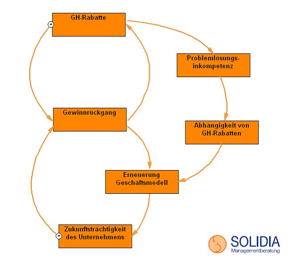 Diese kurzfristig wirksame Lösung hat unbeabsichtigte Konsequenzen beziehungsweise Nebenwirkungen. Je höher die Rabatte, desto größer wird der Mangel an Problemlösungskompetenz und desto größer wird die Abhängigkeit von Rabatten beziehungsweise Subventionen und desto größer wird die Notwendigkeit, Aktivitäten zur Erneuerung des Geschäftsmodells zu entfalten. Je mehr unternommen wird, um einen problemkorrigierenden Prozess in Gang zu setzen und Aktivitäten zur Erneuerung des Geschäftsmodells zu entfalten, desto besser ist die Zukunftsträchtigkeit des Geschäftsmodells. Je besser diese ist, desto geringer sind die Gewinnrückgänge. Je geringer diese sind, desto geringer sind die Aktivitäten zur Erneuerung des Geschäftsmodells, desto geringer ist die Zukunftsträchtigkeit des Unternehmens und desto größer sind die Gewinnrückgänge.