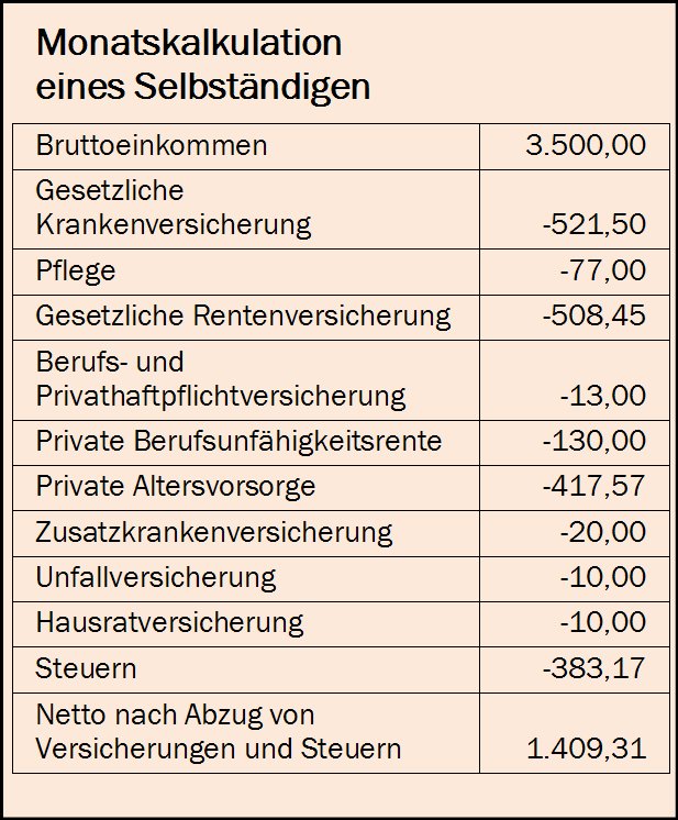 Hat der Trainer noch Betriebsausgaben für Verwaltung, Akquise und Reisekosten, z.B. in Höhe von monatlich 445 Euro, muss ein Trainer monatlich 3.945 Euro erwirtschaften.