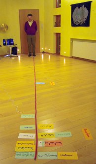 Spontan entschied ich mich, den Berichterstatter auf eine Bodenskala(1) von 0 bis 100% zu stellen und als Startposition die 0% einzunehmen. Die anderen Gäste sprachen ihm dann jeweils von der 100% Position leicht trancehaft jeweils einen der drei favorisierten Werte zu. Den Berichterstatter bat ich, die Augen zu schließen und die Angebote eher intuitiv als kognitiv wahrzunehmen. Werte wahrzunehmen benötigt einen emotionalen Zugang, so meine Hypothese. Nach einer angemessenen Zeit durfte er sich dann auf der Skala bei dem prozentualen Wert dort positionieren, wo der Wert entsprechend seiner Innenschau für die geschilderte Situation stimmig war. Das wiederholte sich mit wachsender Aufmerksamkeit insgesamt 12-mal.